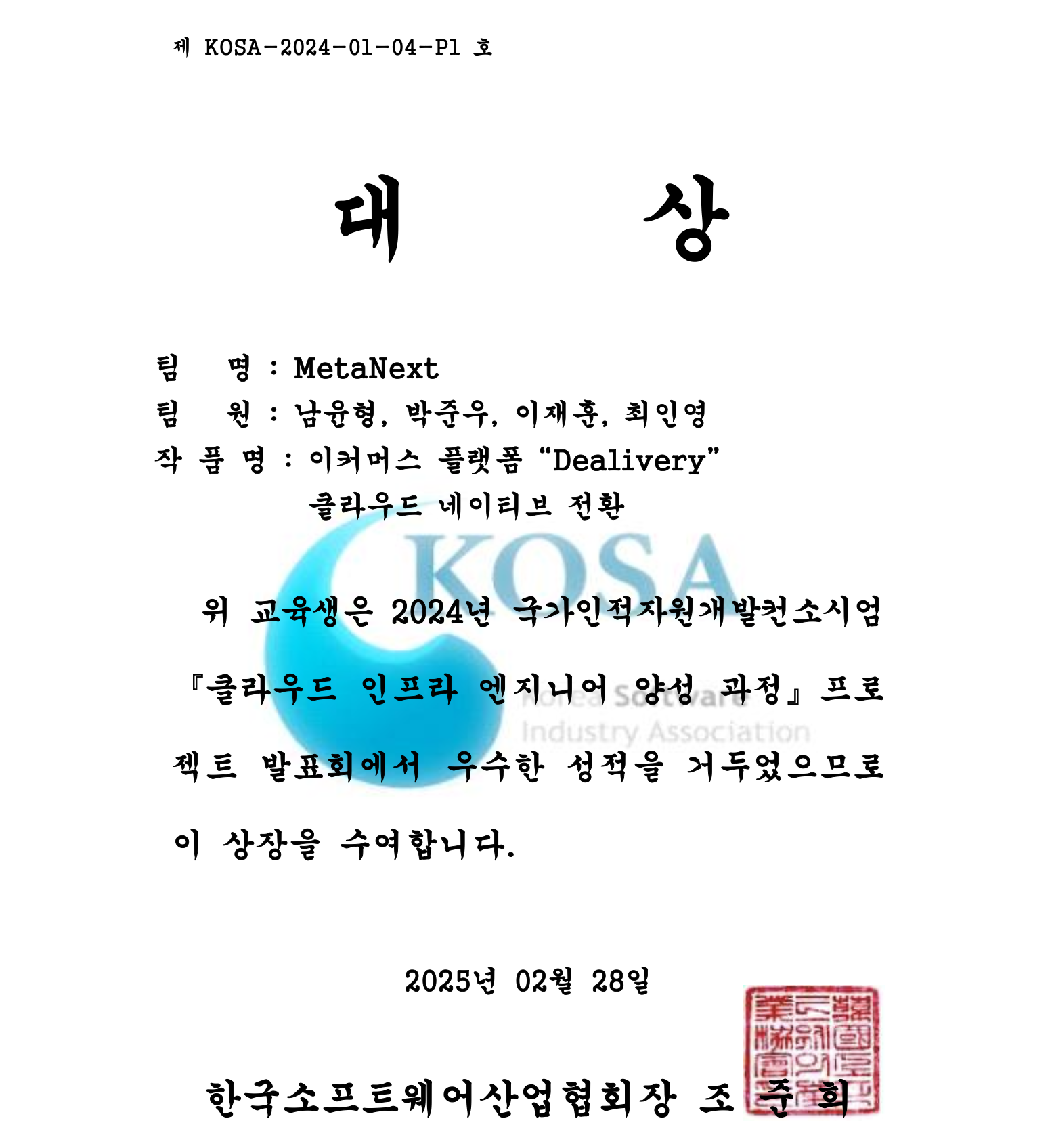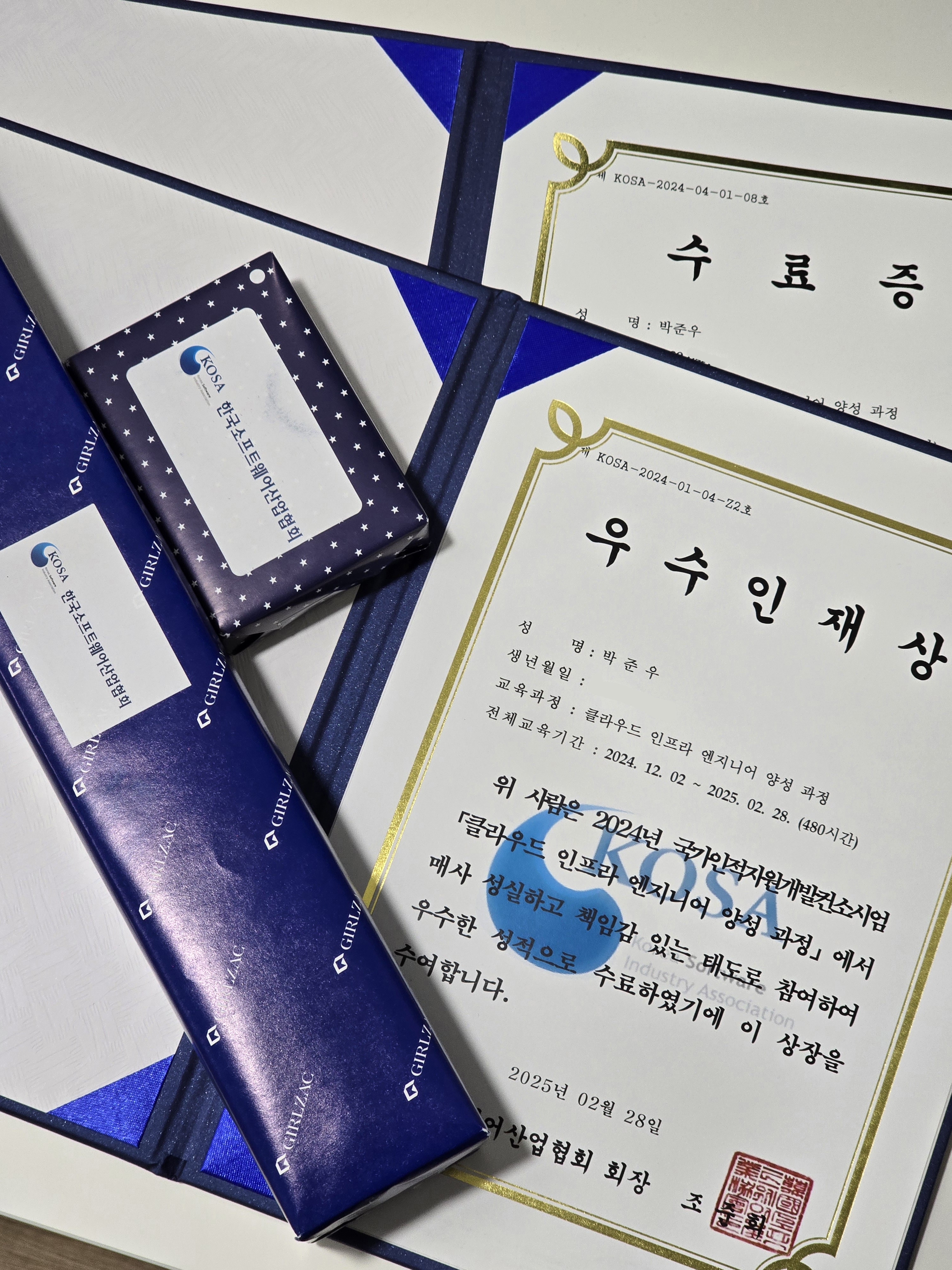 최근 3개월 동안 한국소프트웨어산업협회(KOSA)에서 진행한 클라우드 인프라 엔지니어 양성과정을 마쳤다.