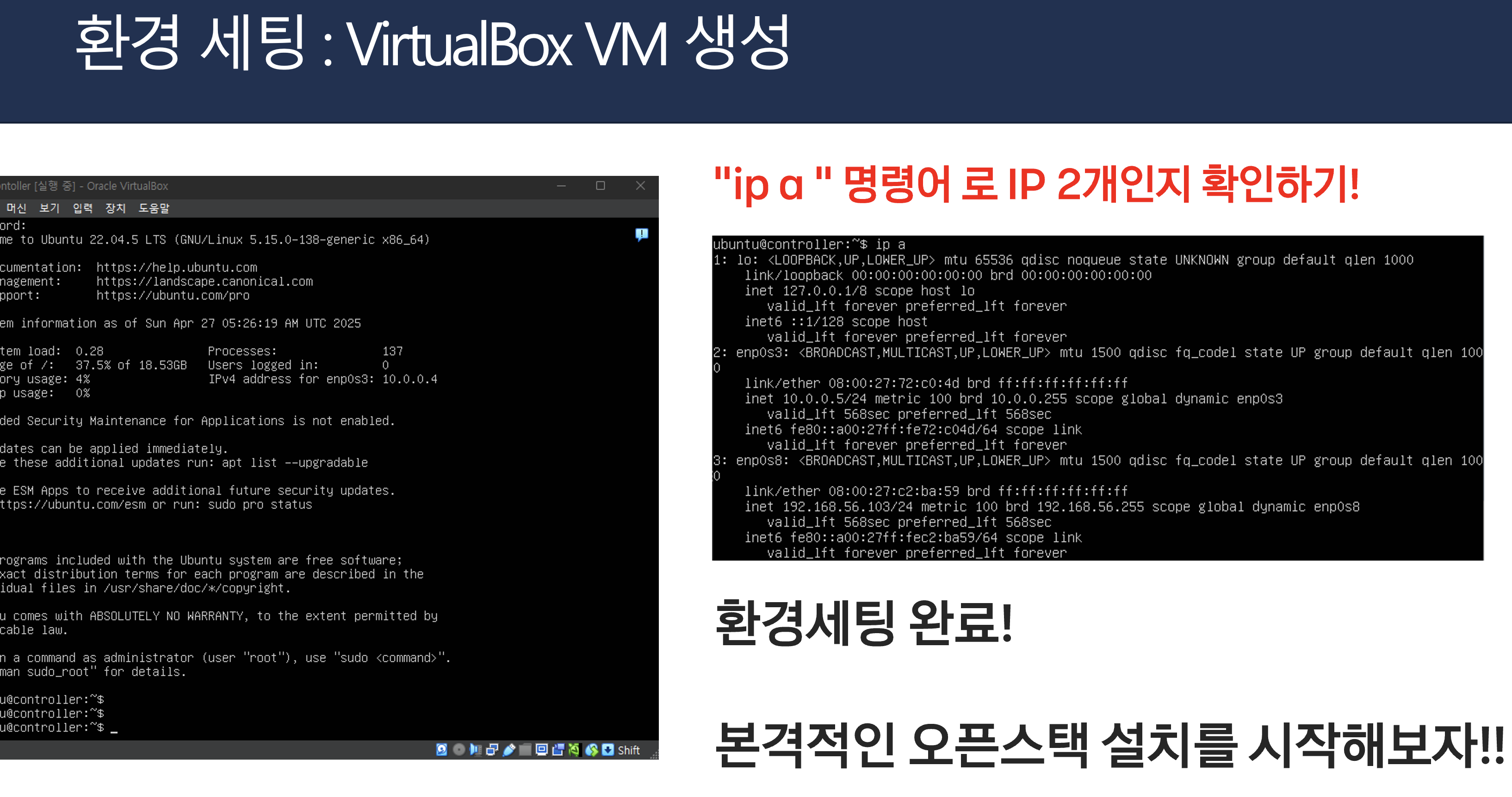 환경 구축부터 설치, VM 생성, 통신까지의 흐름을 직접 체험할 수 있도록 구성했다.